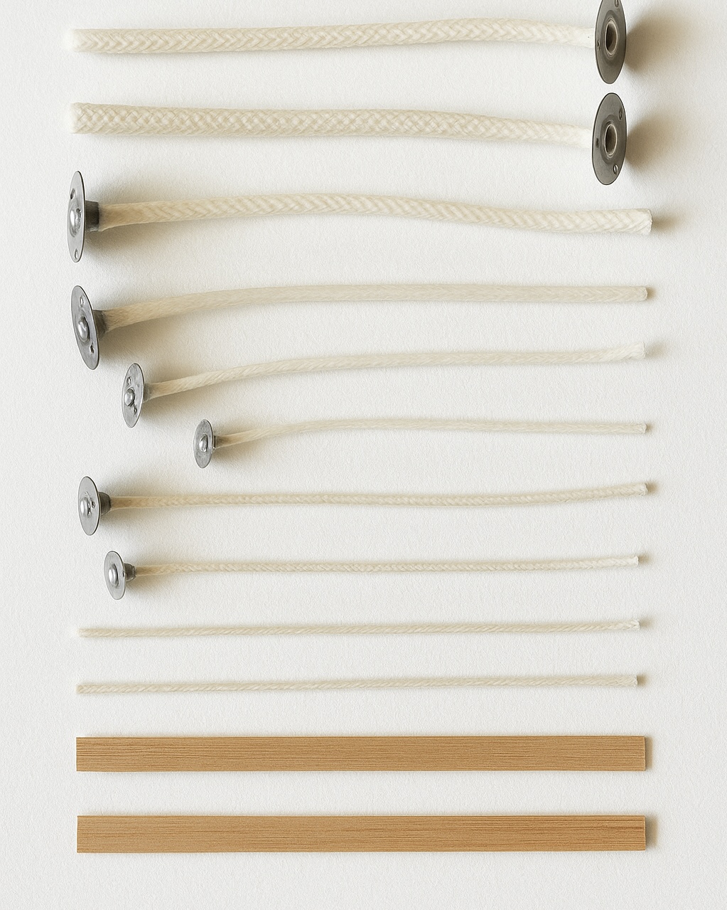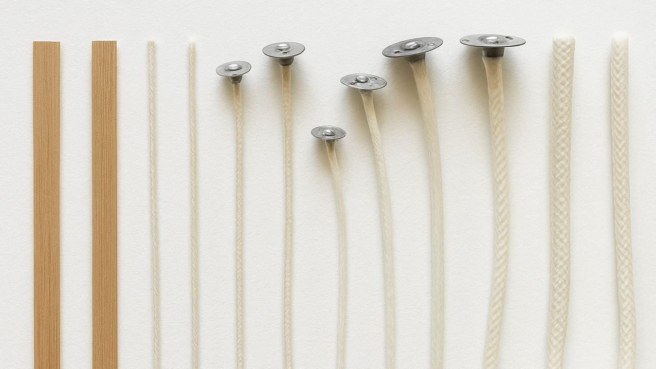 O coração da vela. O pavio regula a queima — se for pequeno demais, a chama apaga; grande demais, a vela queima rápido e solta fuligem. O equilíbrio começa aqui.